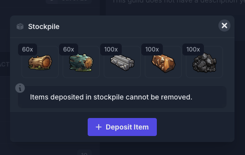 The guild stockpile is a dedicated pool of resources that can only be used for the guild hall and its components. Unlike a bank, once resources are contributed, they cannot be withdrawn. These resources are essential for maintaining and upgrading guild structures, such as repairing components of the guild hall.